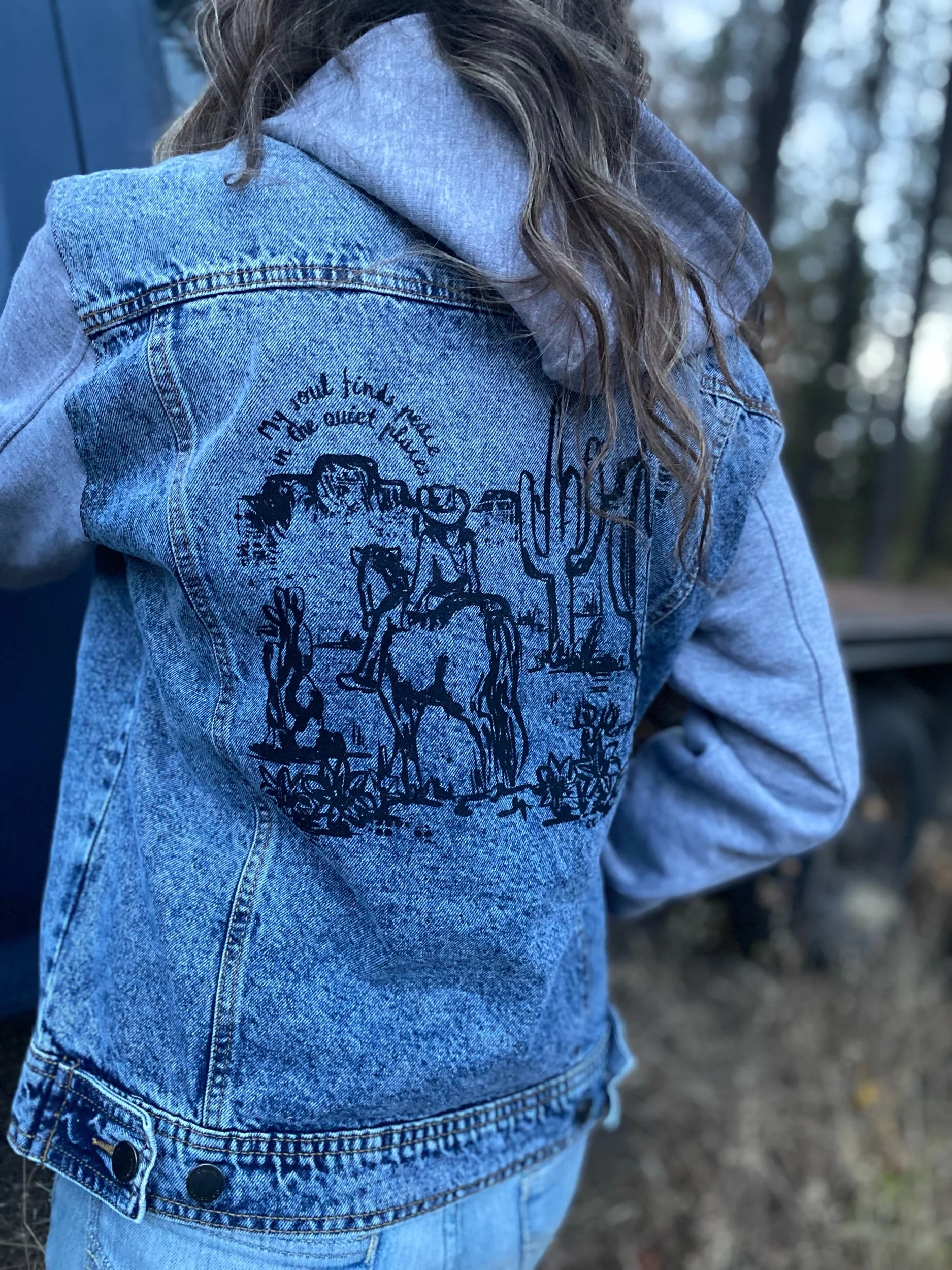 Printed on the back in black ink, is a romantic western image of a cowgirl on her horse admiring the beauty of the landscape in front of her. Enjoying the quiet places for her mind and soul to find rest in.
