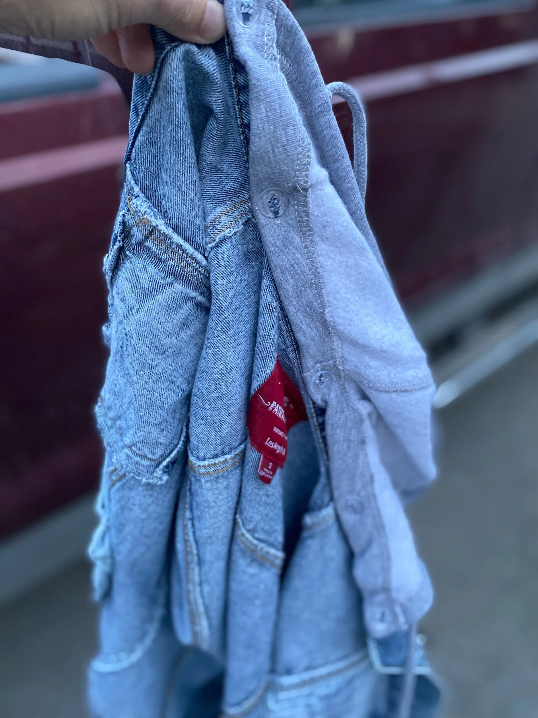 100% cotton boyfriends jacket for a roomy relaxed fit. This is an enzyme-washed denim with a fun and cozy contrasting gray fleece sleeve and detachable hood with matching drawstrings, two flap pockets, and two outside standard pockets. Durable denim jacket for everyday use. Every jacket is different, there are no 2 the same!