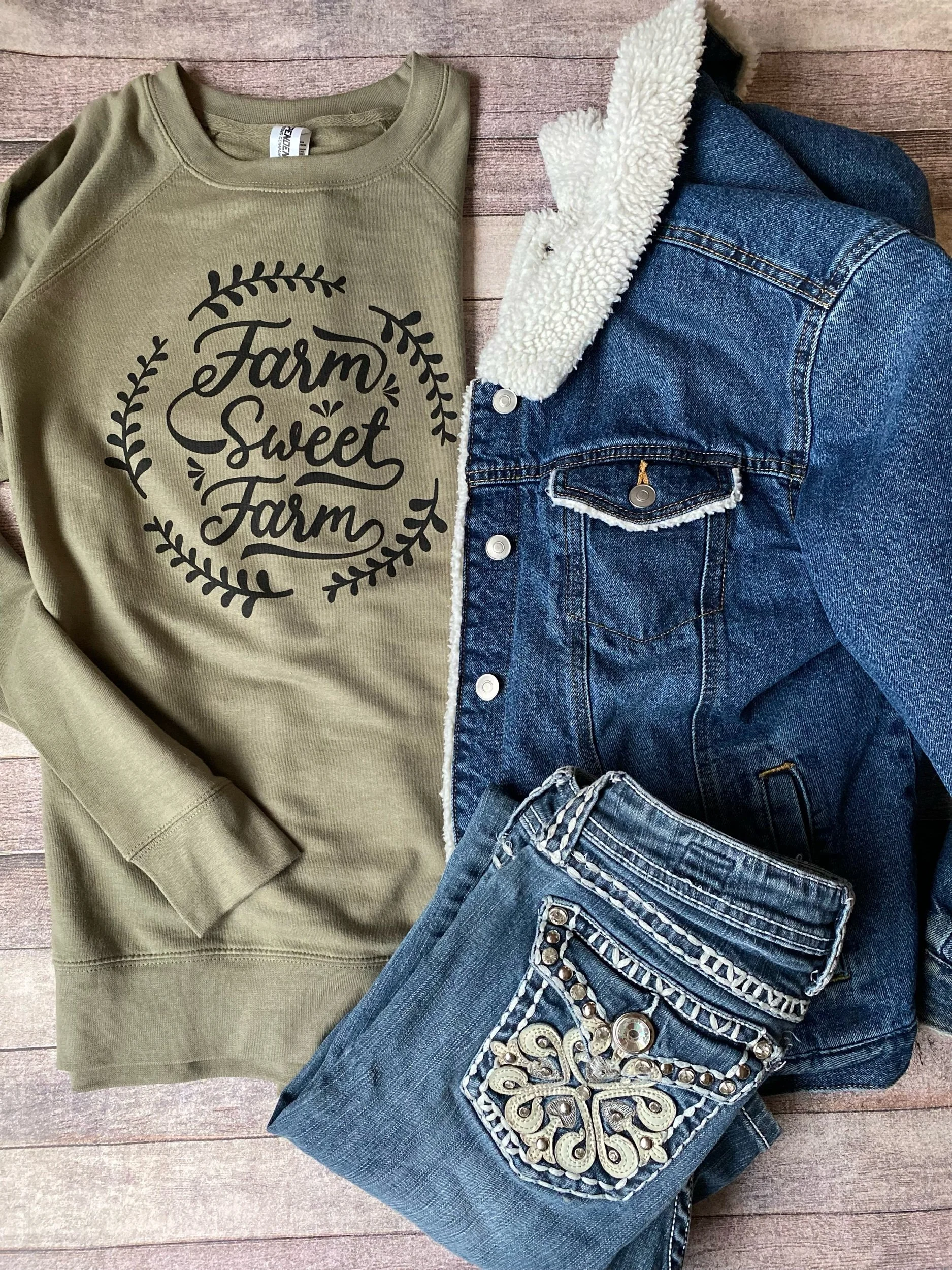 A cozy olive green sweatshirt that will quickly be your new favorite! Long live the “Farm Sweet Farm”