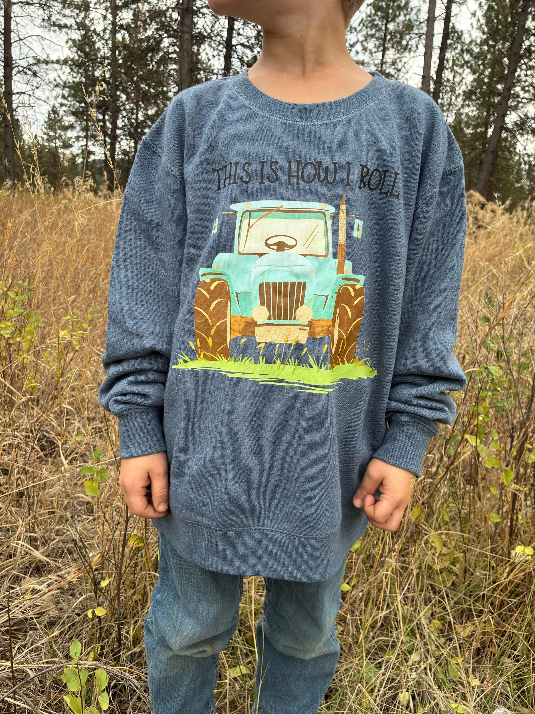 Or choose a super soft- heather blue sweatshirt with a tractor design that says, “this is how I roll.”