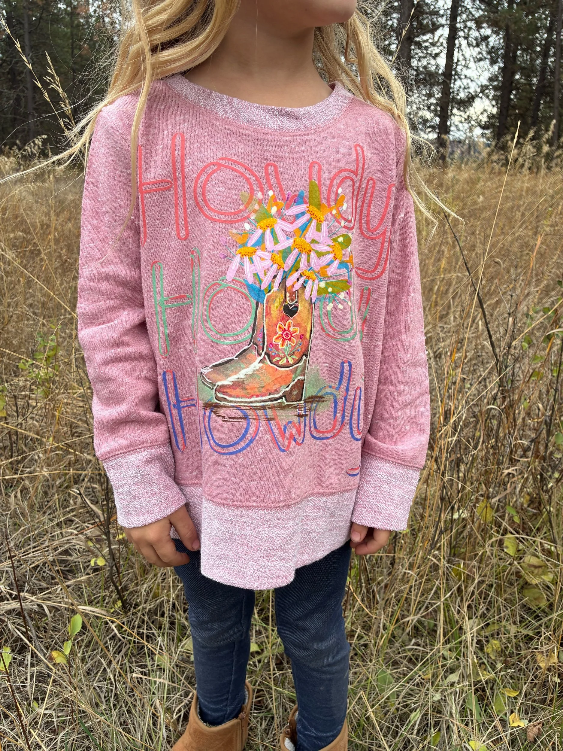 A pink girls “HOWDY” design this sweatshirt has the most adorable elbow “pads” you’ve ever seen!